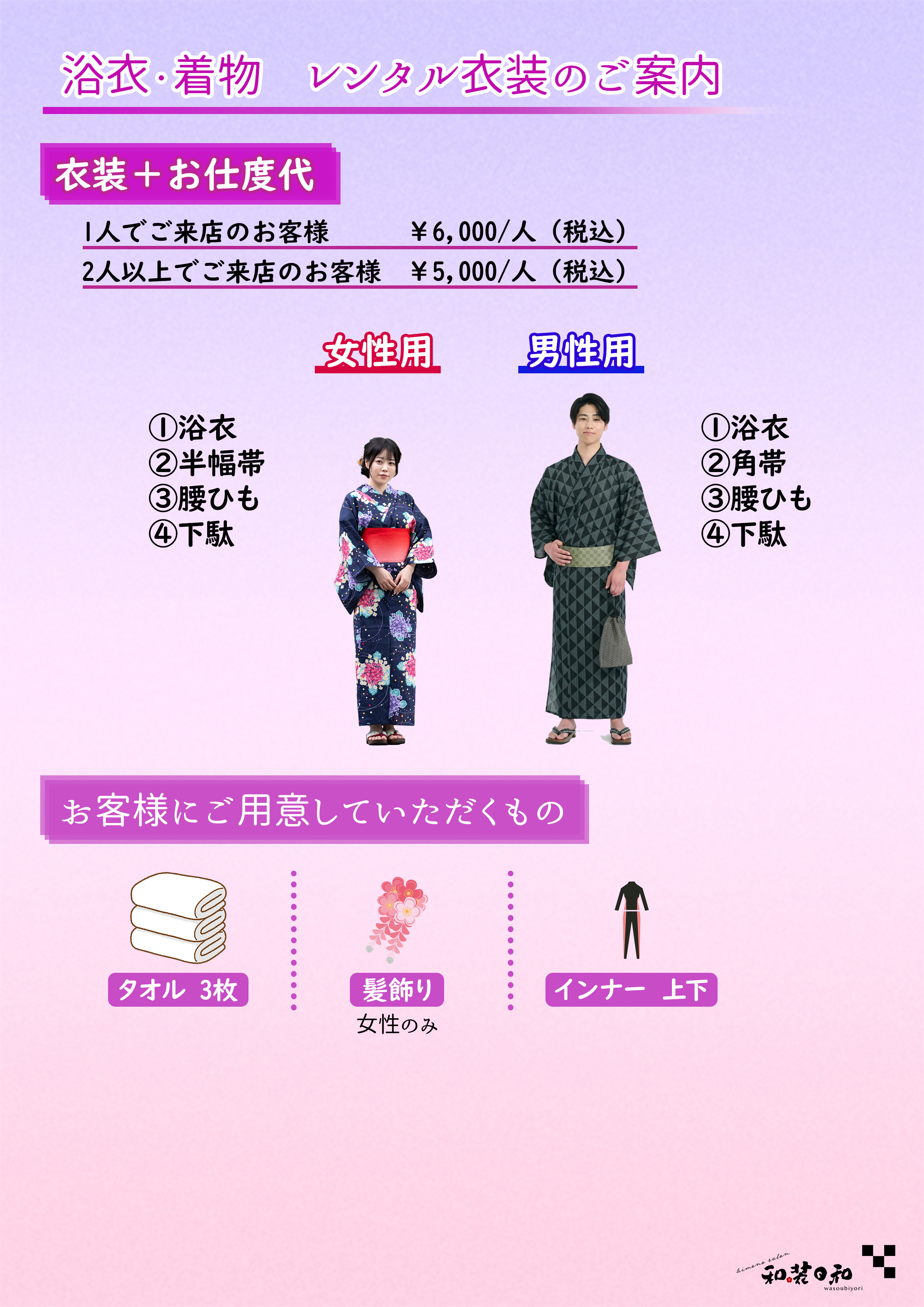ご予約の際は、「ご希望日時・ご利用人数・代表者のお名前・衣装の種類」をお知らせください。