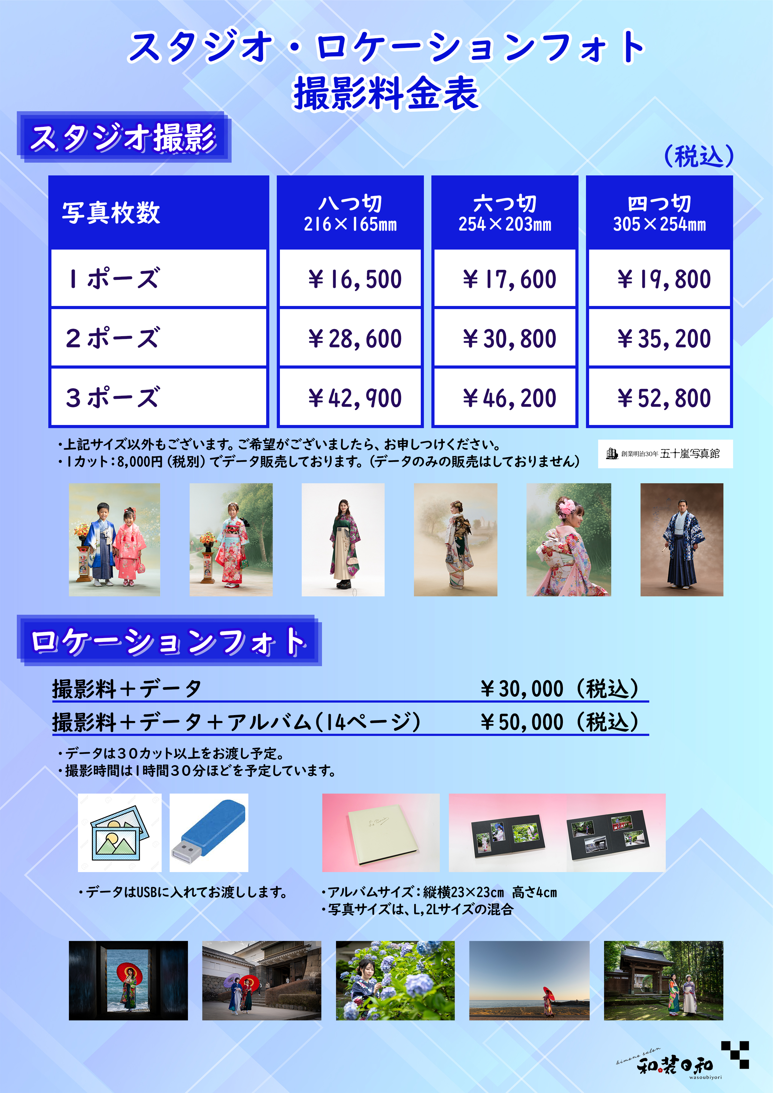 受付けは五十嵐写真館の2Fにございます。玄関入ってすぐの階段でお上がりください。
