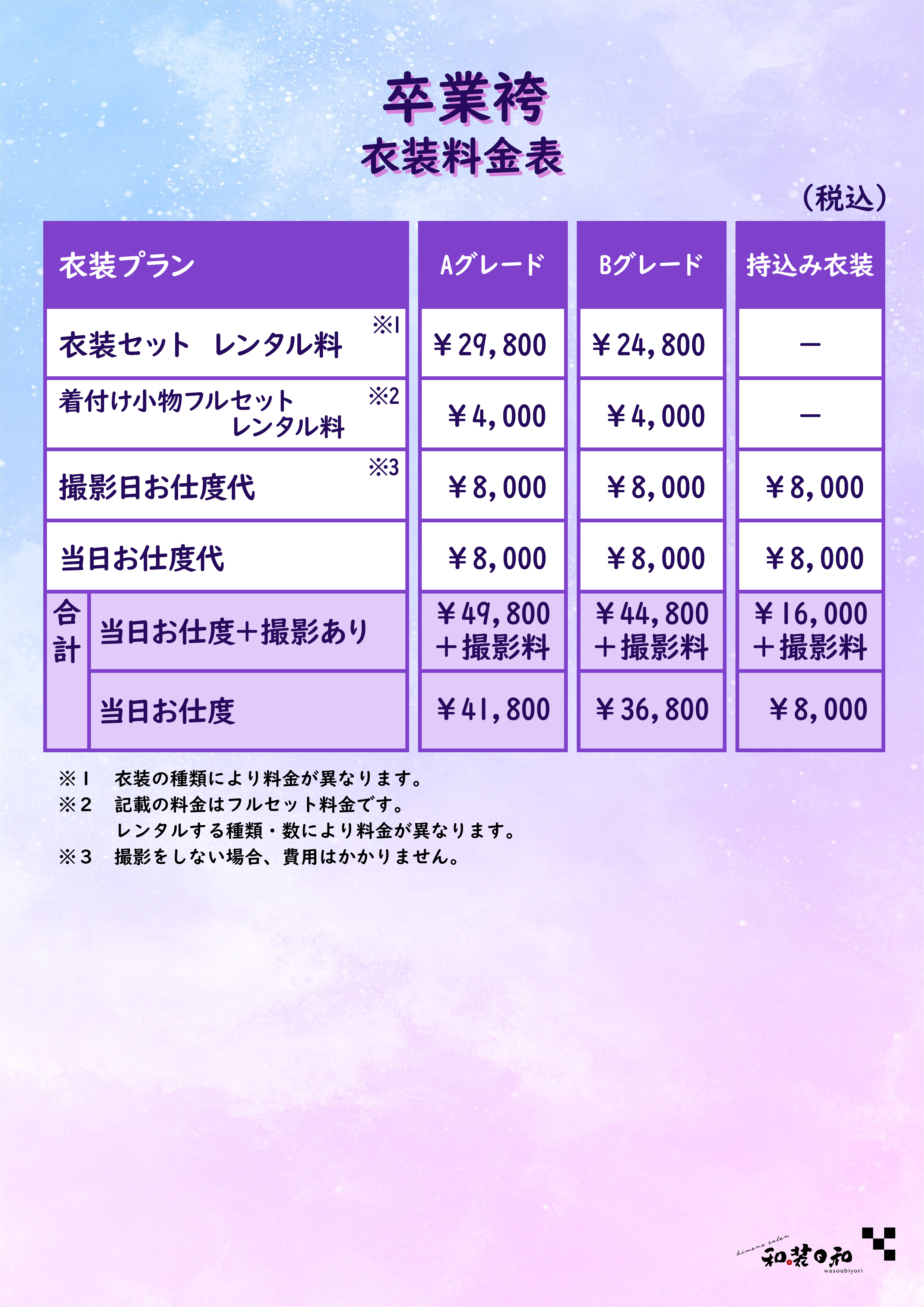 ご予約の際は、「ご希望日時・ご利用人数・代表者のお名前・衣装の種類」をお知らせください。