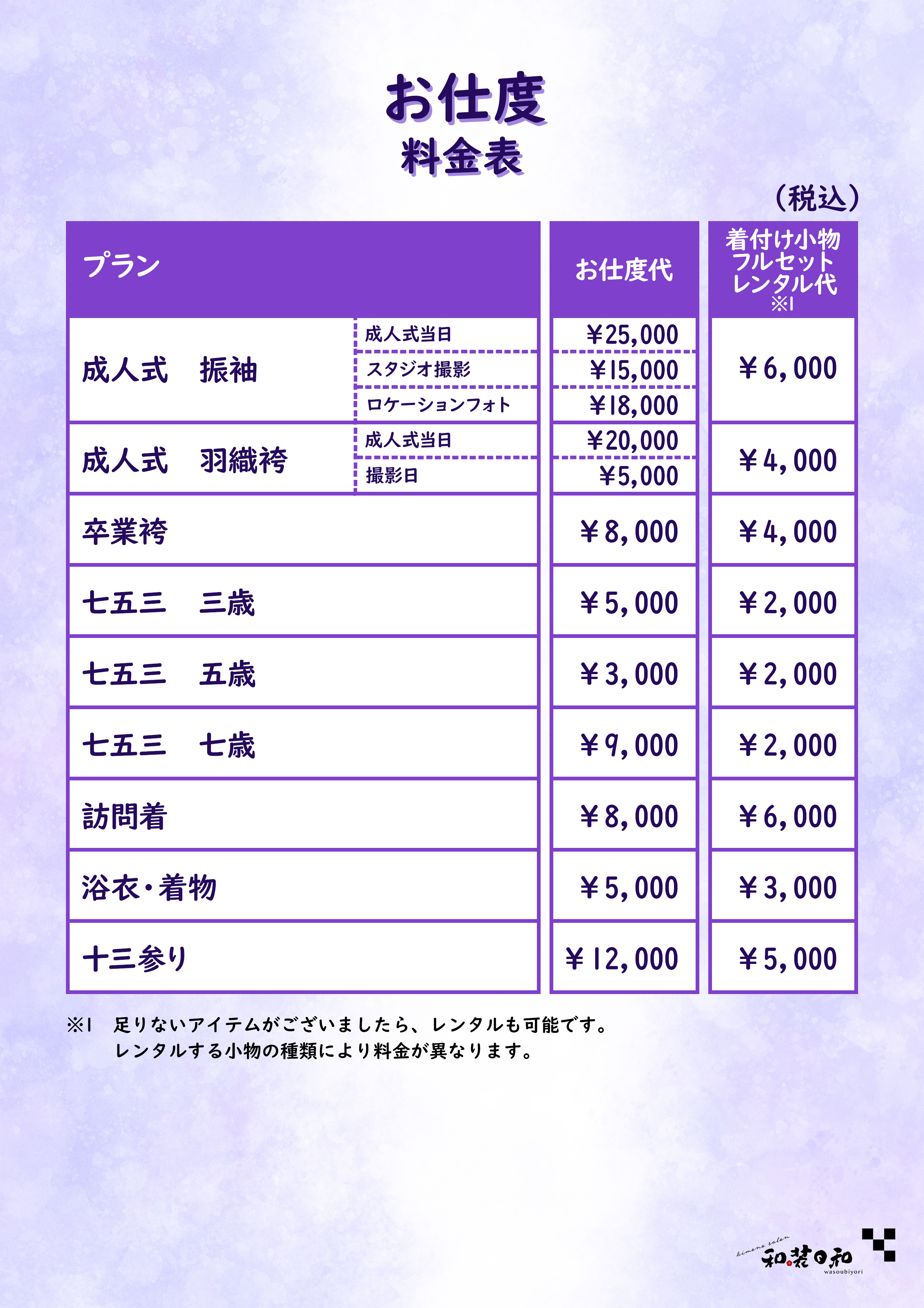 衣装によりお支度時間が異なります。お時間に余裕を持ちましてご予約ください。